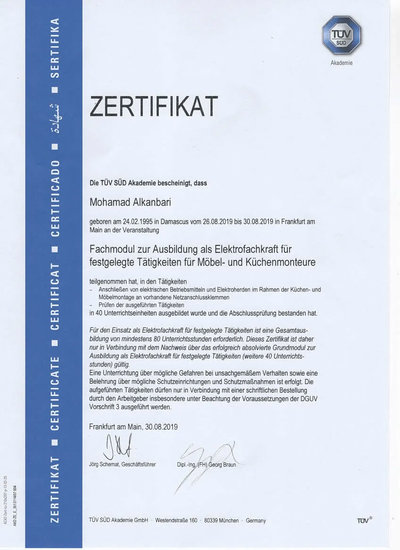 Wir sind unter anderem vom TÜV geprüft für den fachgerechten Anschluss und die Inbetriebnahme von Elektrogeräten sowie den Anschluss aller relevanten Geräte an Wasser und Abwasser.